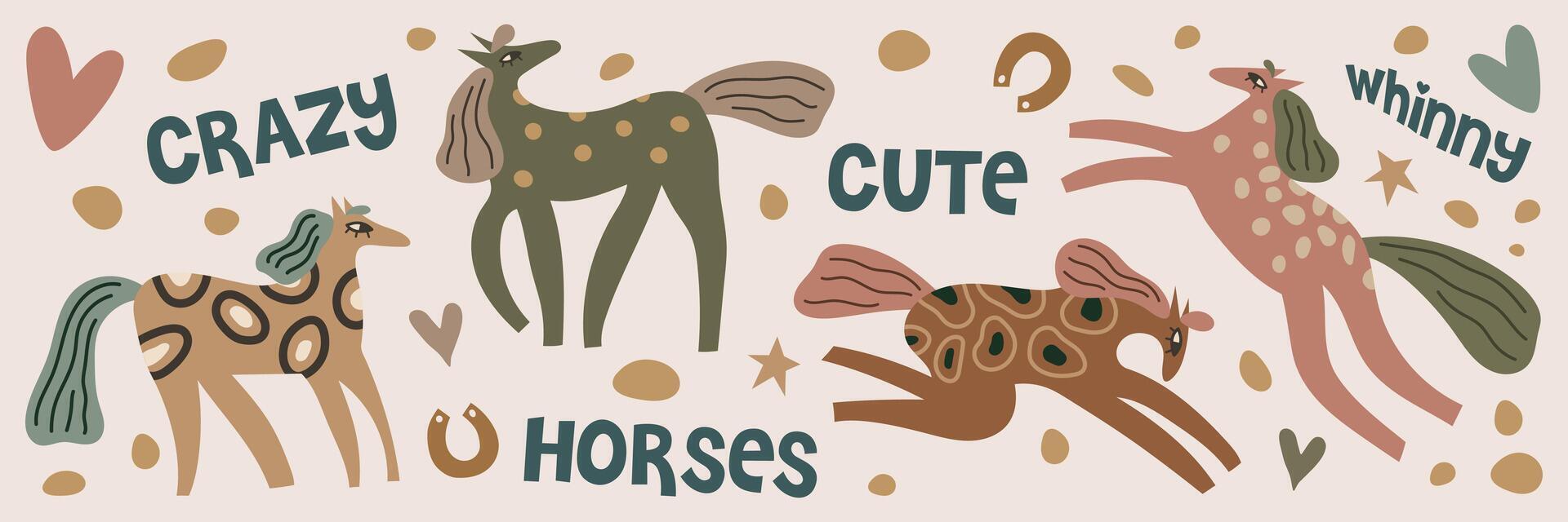 Whimsical Horses with Playful Expressions Illustration. Featuring various textures and patterns, these horses add a lively touch with hearts and stars. Pro Vector