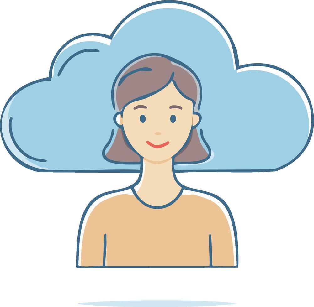 Flat illustration Woman in front of cloud. Symbol for data storage, information technology, remote access, and web services Pro Vector