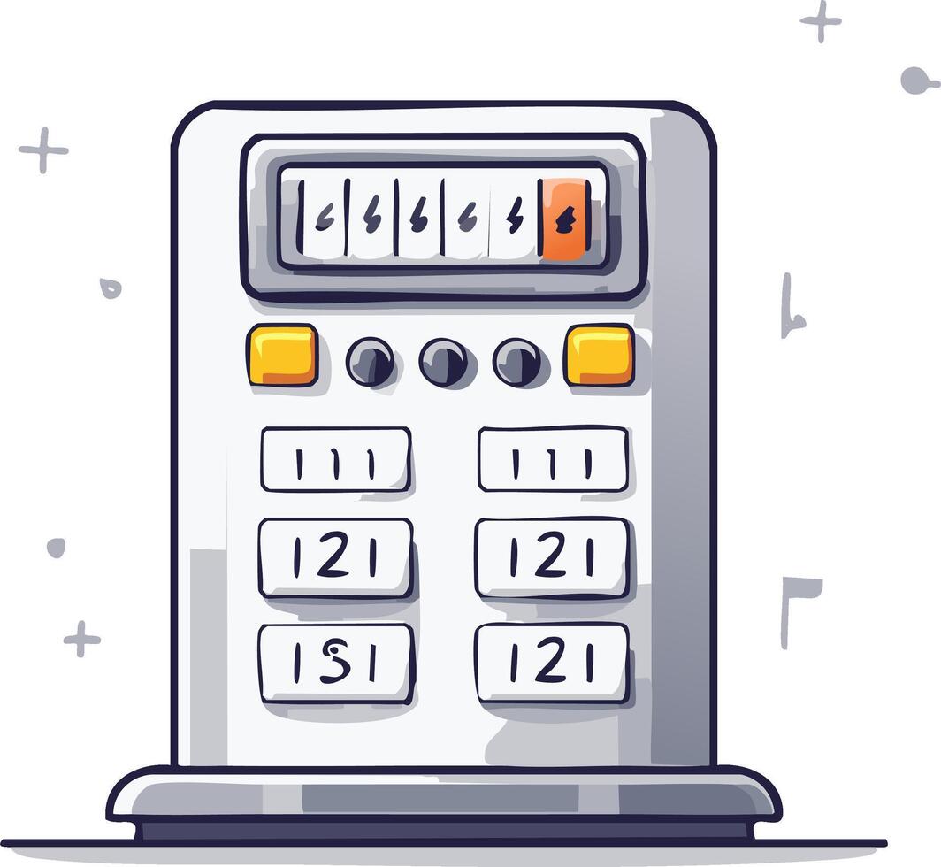 Hand-drawn doodle illustration of a retro calculating machine with a rolling number counter and keypad Pro Vector