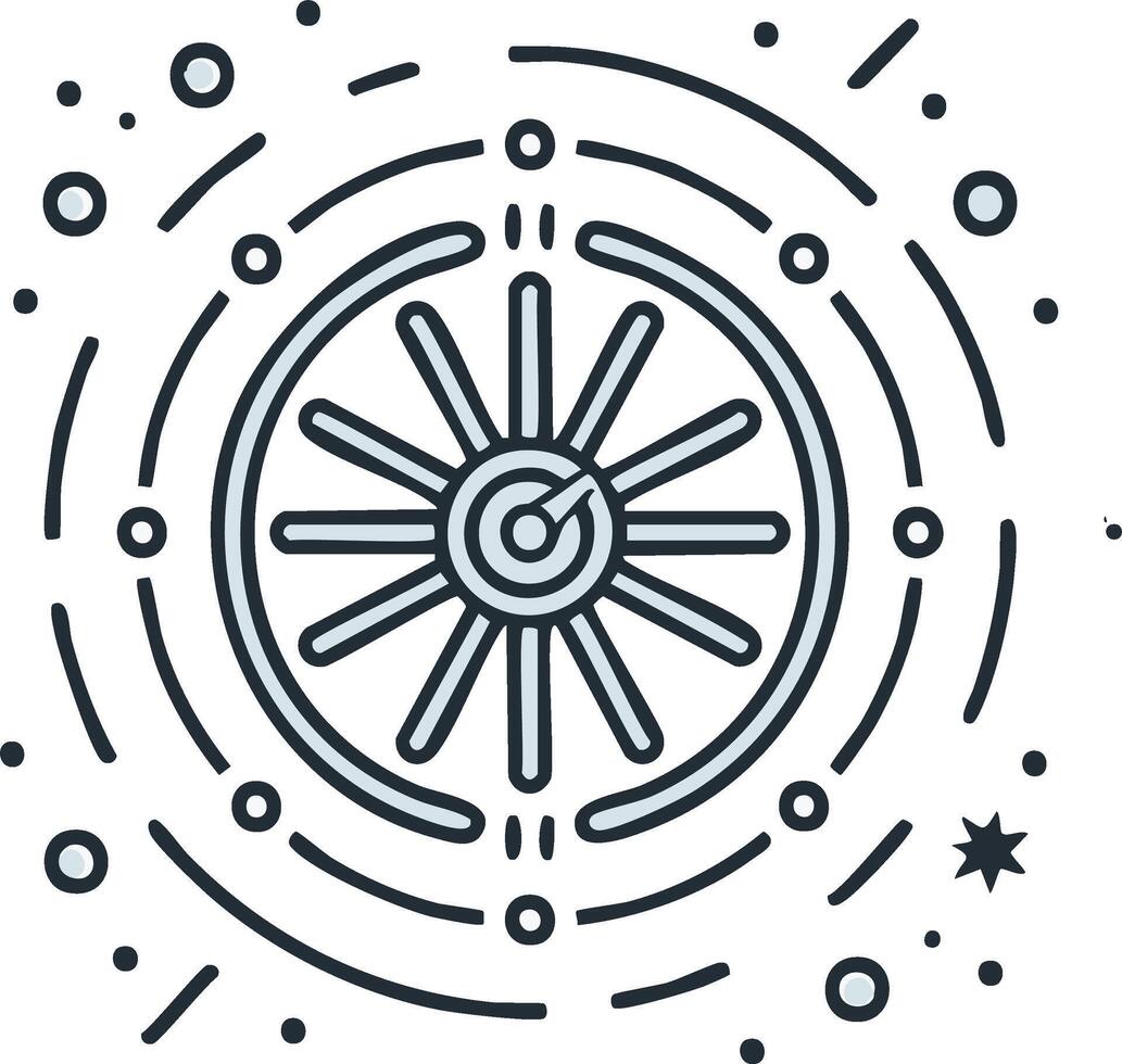 Abstract Circular Symbol with Spokes and Rotating Hand Surrounded by Cosmic Orbits and Geometric Shapes Pro Vector