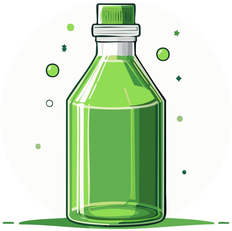 Bottle of Green Liquid Elixir with Lid Surrounded by Floating Green Elements Pro Vector