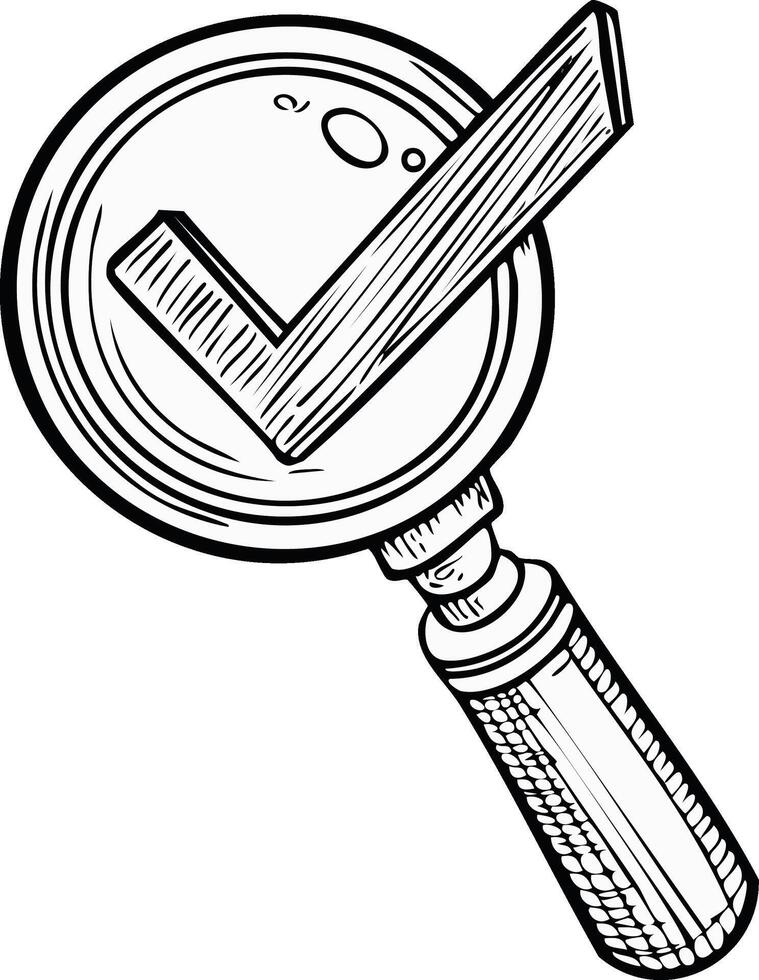 Hand drawn magnifying glass with checkmark for successful search verification and accuracy Pro Vector