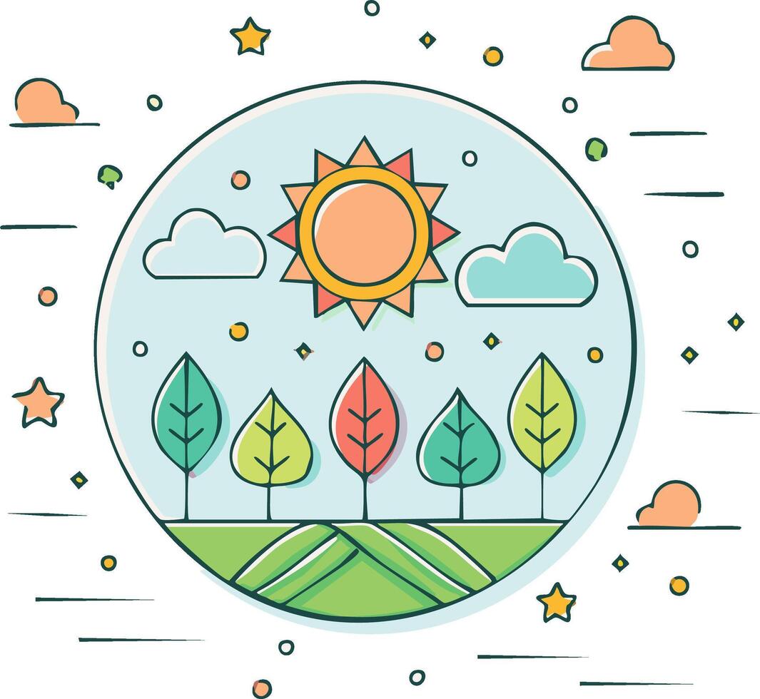 Stylized outdoor scene with sun clouds trees and fields in a circular frame Pro Vector