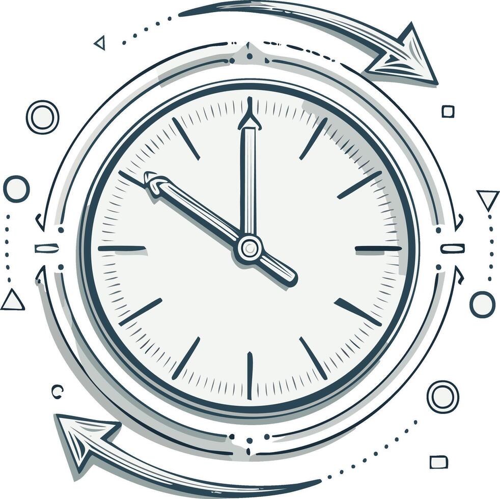 Clock face surrounded by circular arrows depicting the passage of time and geometric figures on a white background Pro Vector