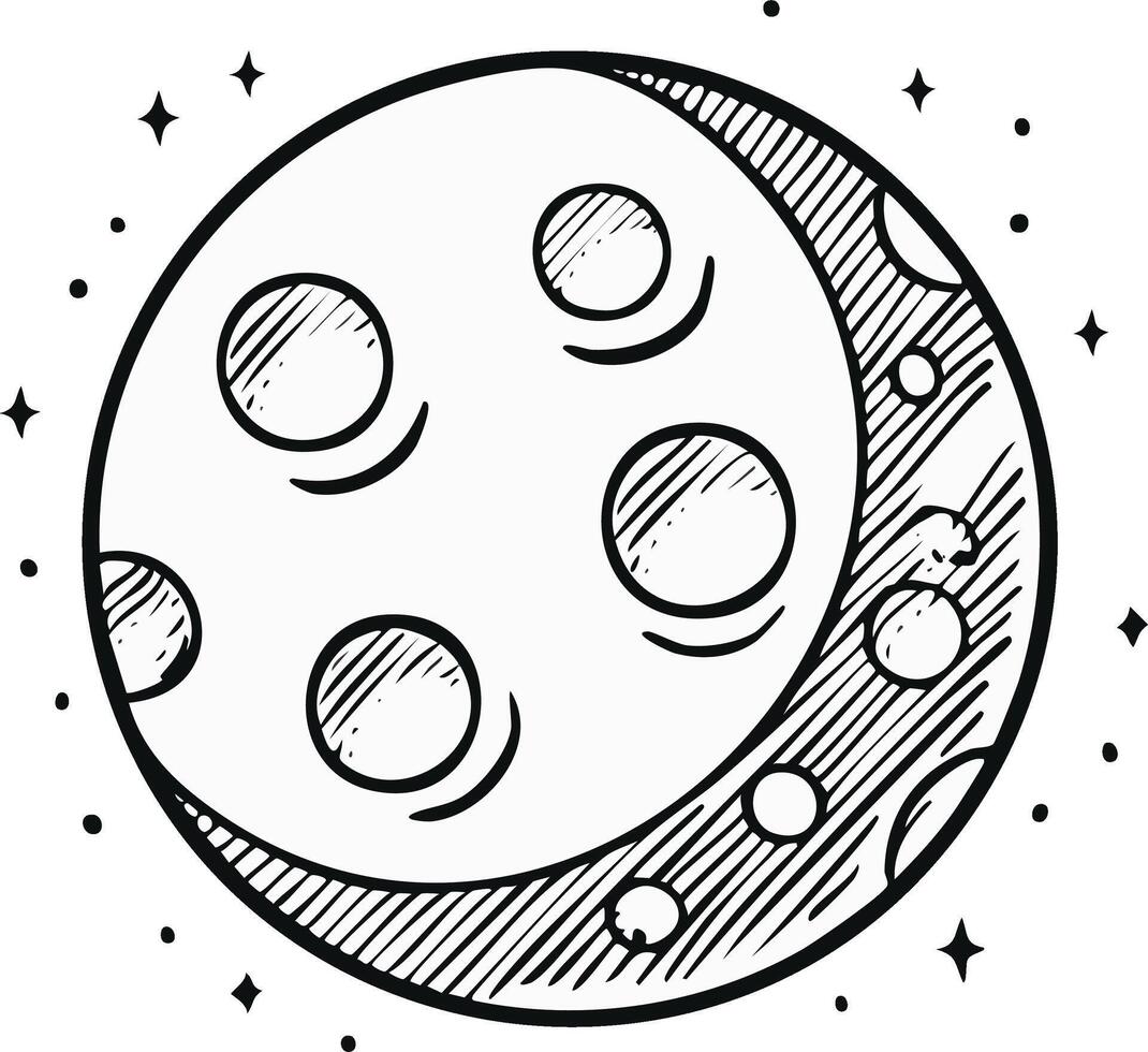 Hand drawn moon with craters and stars in a sketchy line art style Pro Vector