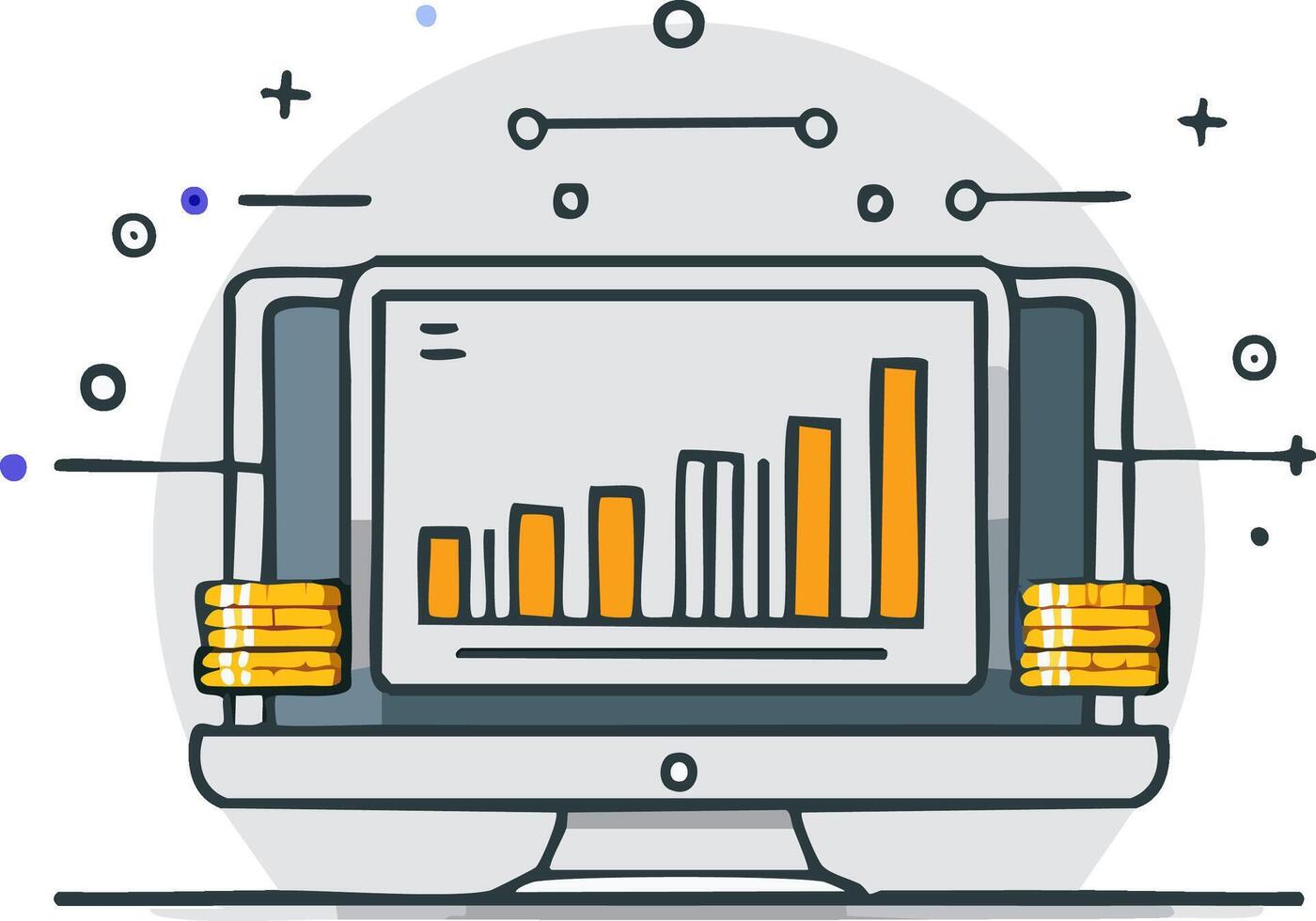Desktop computer displaying a bar graph with rising bars and stacks of coins symbolizing financial growth and success Pro Vector