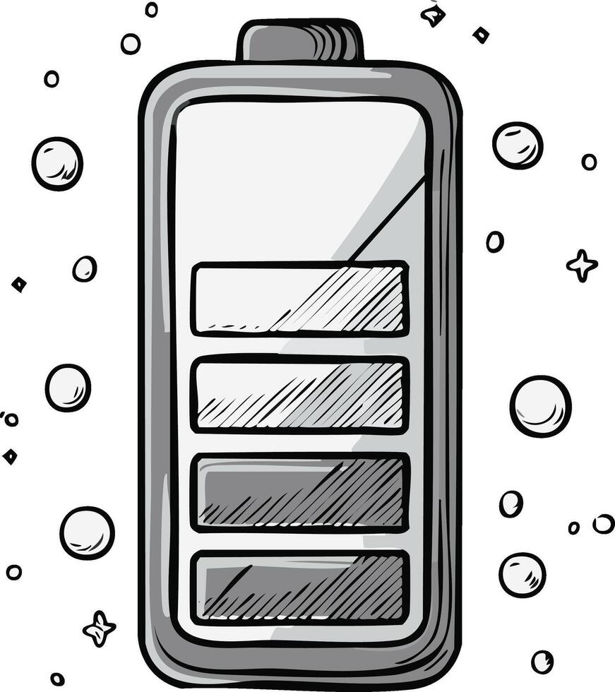 Hand drawn battery icon showing partial charge level with surrounding bubbles and sparkles Pro Vector