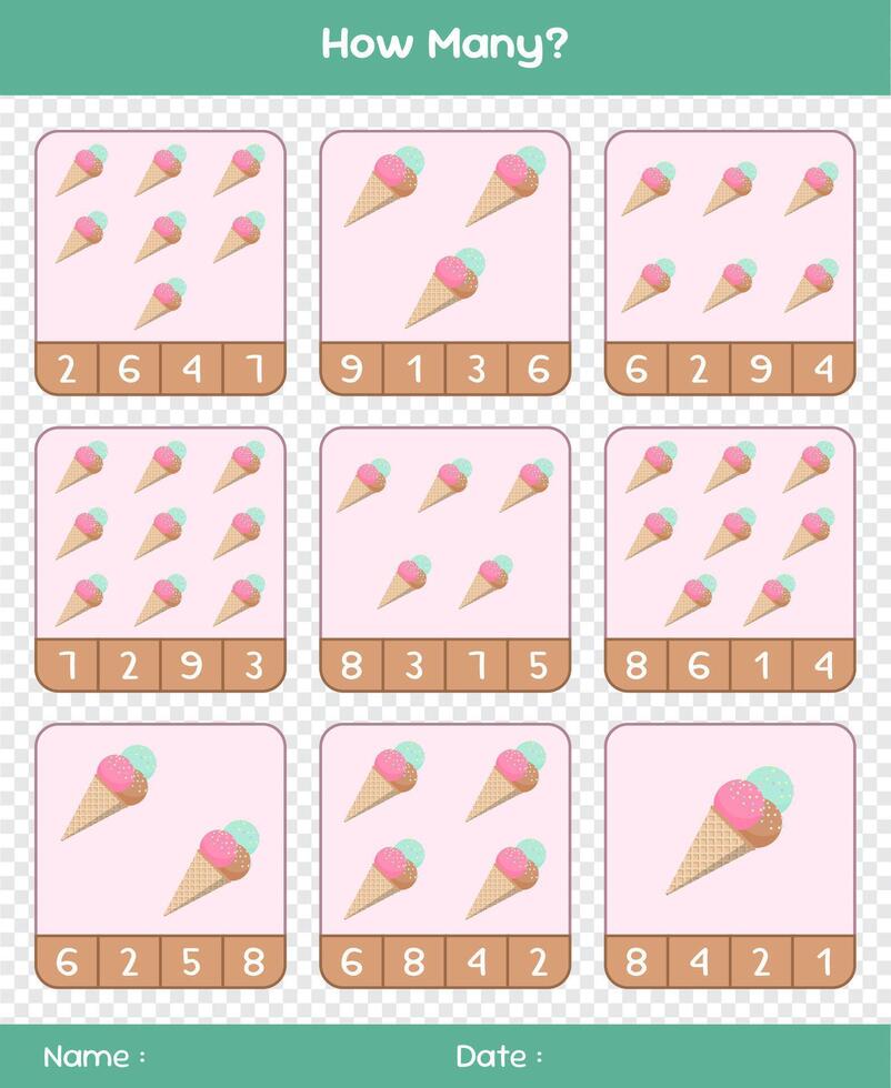 Count the number of ice creams. Educational mathematical game. Counting game for children. Activity sheet. Template for how many Pro Vector