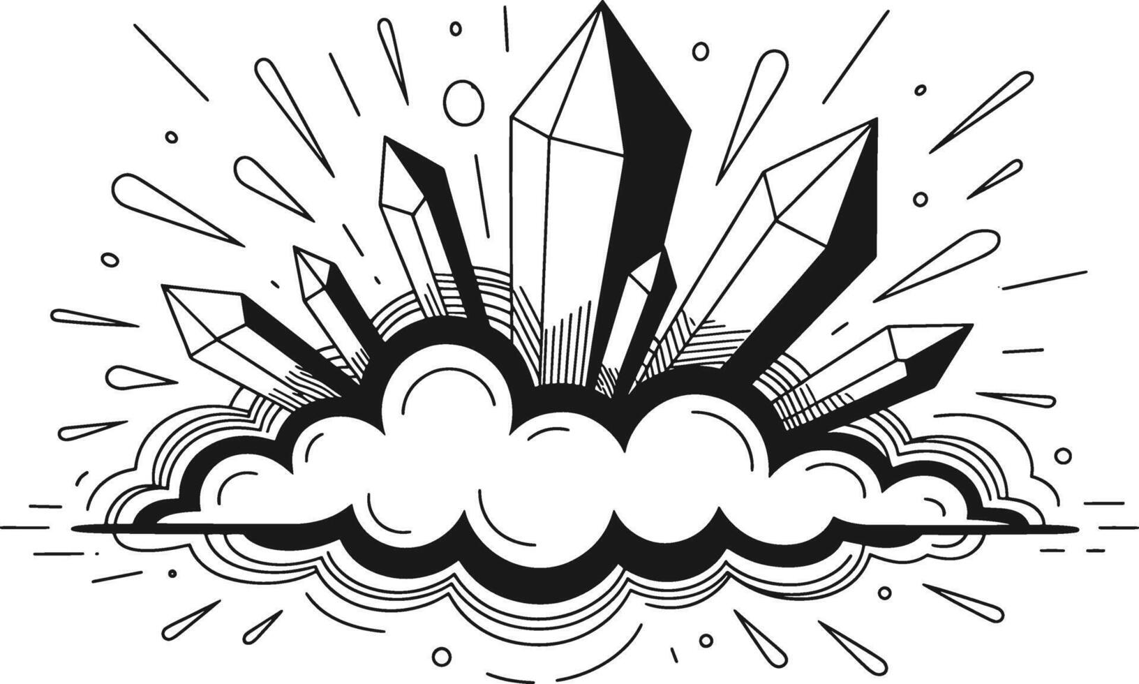 Black and white of a cluster of sharp crystals radiating energy with dynamic lines and dots Pro Vector