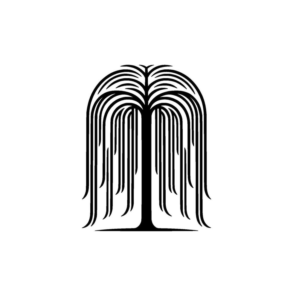 A minimalist illustration of a weeping willow tree silhouette with flowing cascading branches and a solid trunk Pro Vector