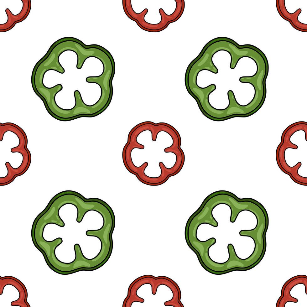 Seamless pattern of sliced bell peppers, featuring alternating red and green rings with bold black outlines and smooth shading, creating a vibrant and fresh culinary background. Pro Vector