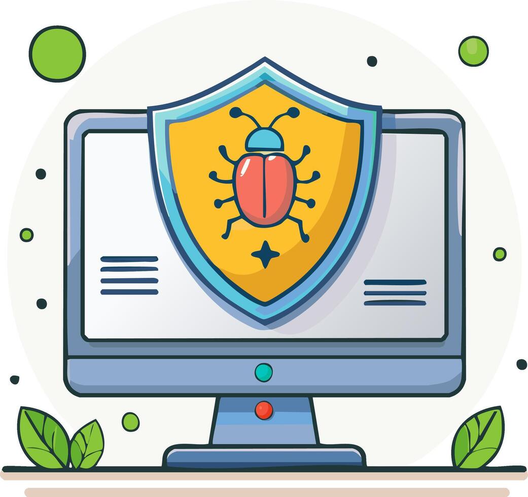 Computer monitor with shield and bug, security concept illustration Pro Vector