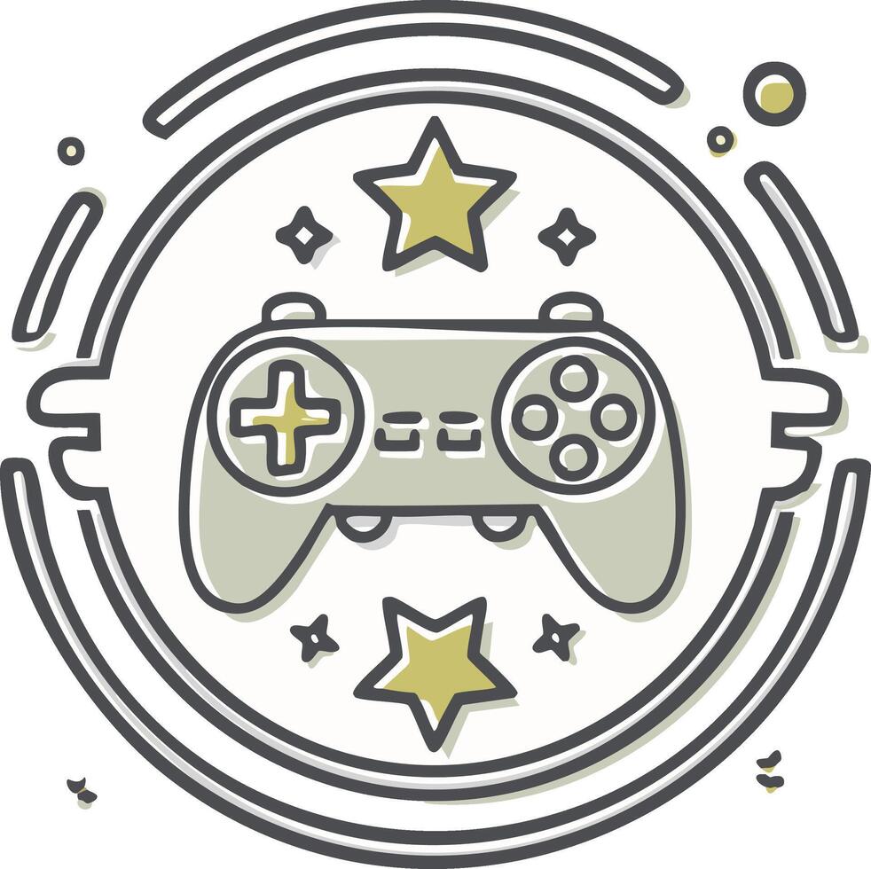 Joyful game controller surrounded by starry celebratory elements and decorative circles Pro Vector