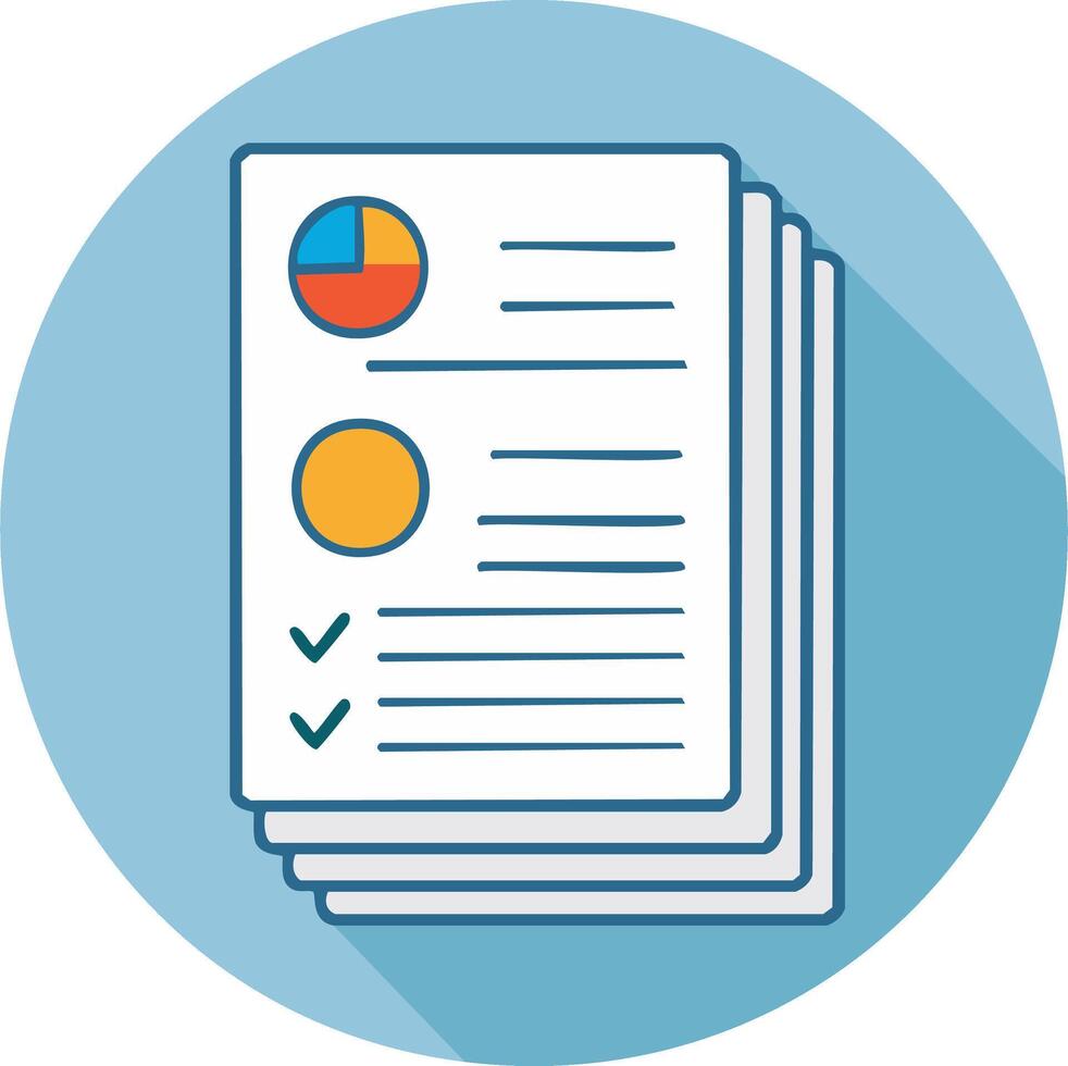 Paperwork Icon Stack with Pie Chart, Circle, Check Marks on Blue Round Background. Documents, Reports, and Accounting Checklist Pro Vector