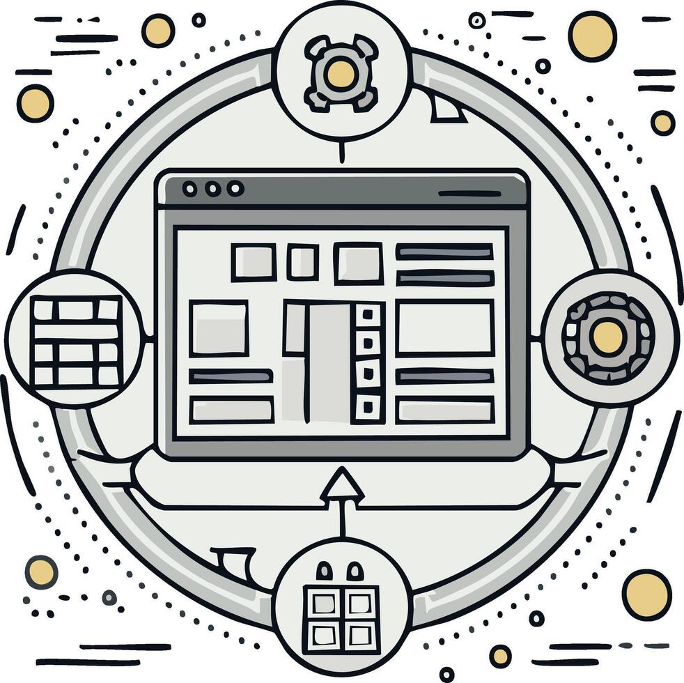 Website Development Process Flowchart Doodle Style Showing Modules and Gears Pro Vector
