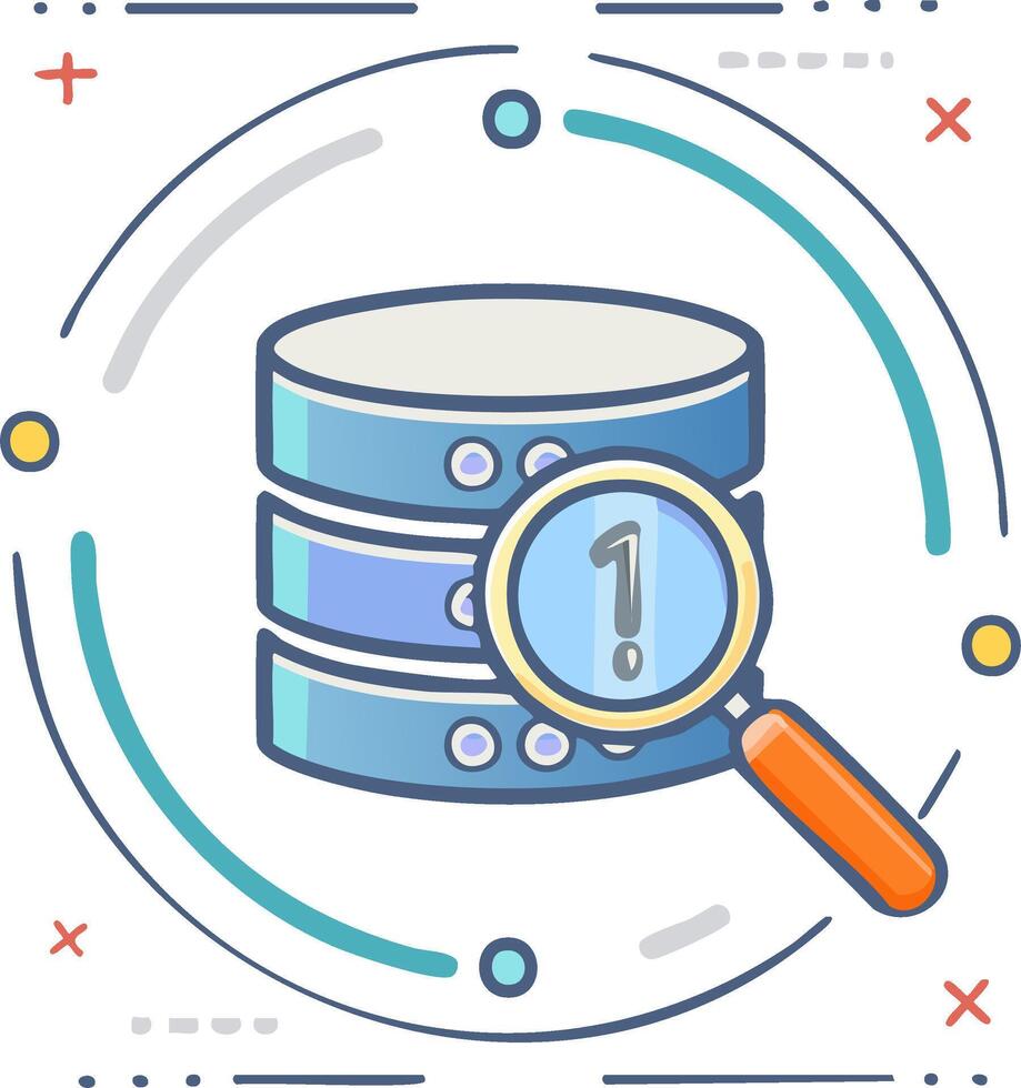 Database icon with magnifier and exclamation point inside a circle in blue tones Pro Vector