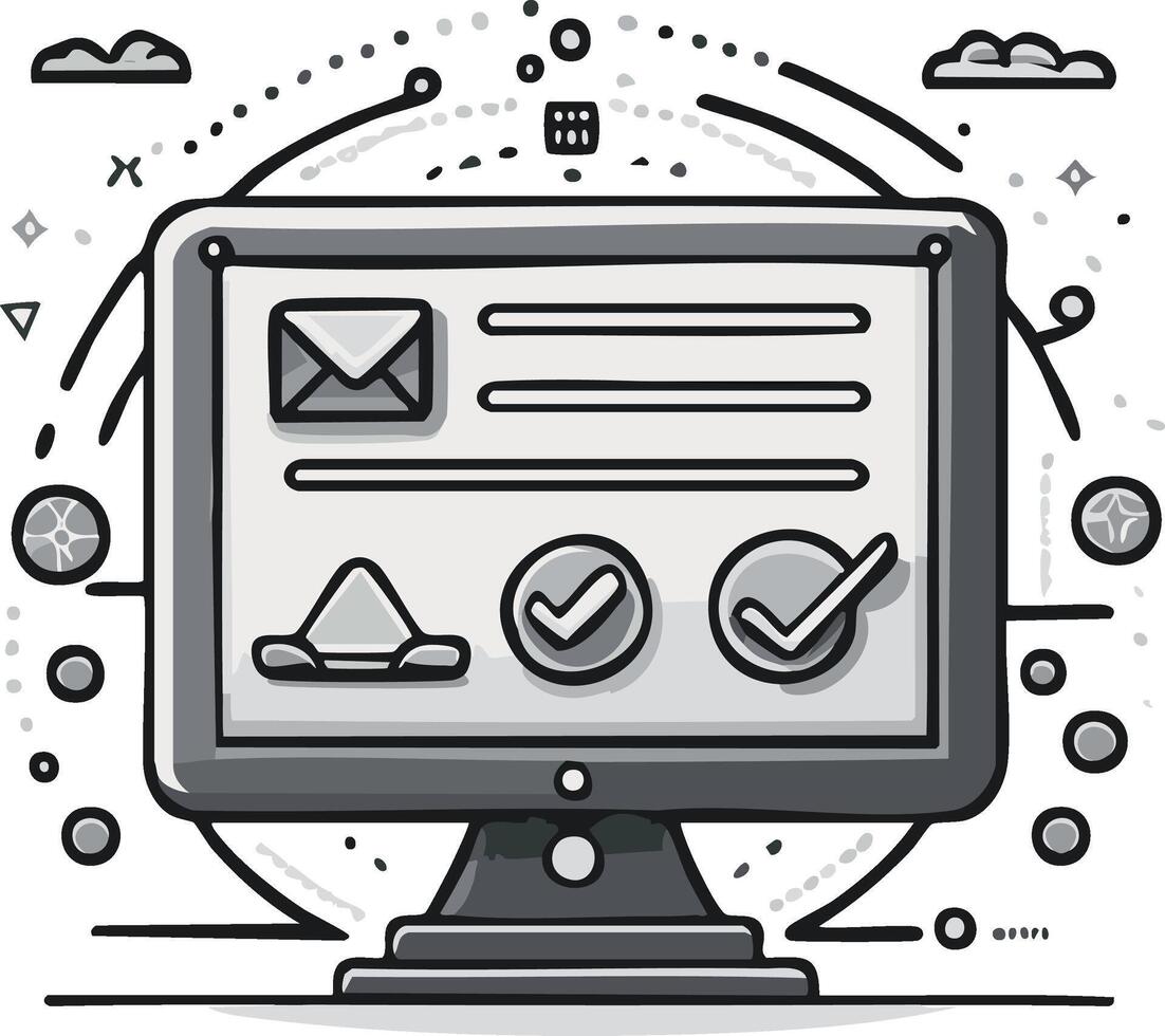 Doodle Style Computer Screen Displaying Email Settings Confirmations and Cloud Storage with Geometric Shapes around the Monitor Pro Vector