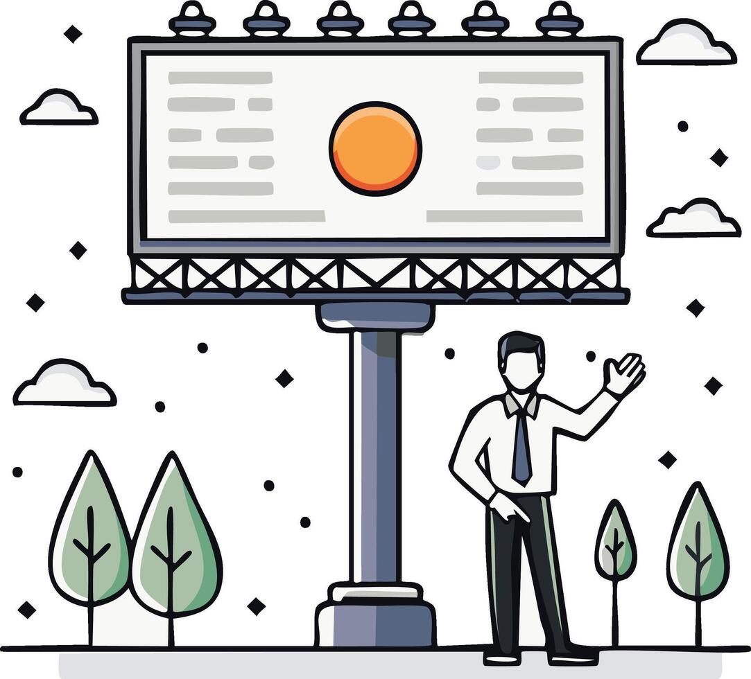 Executive Standing Before a Large Billboard with Abstract Content Waving Hand in a Simplified Flat Design Pro Vector