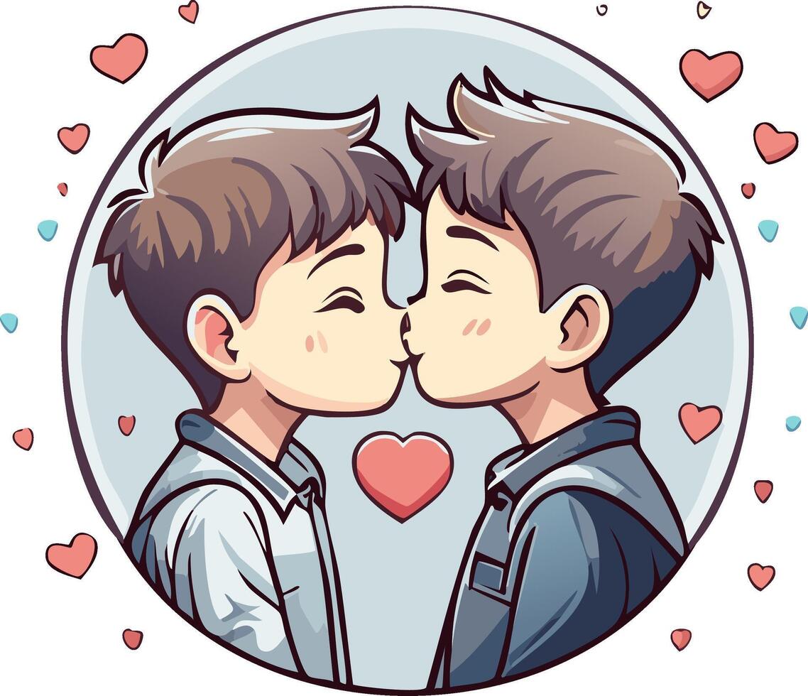 Two boys kissing with hearts floating around them in a circular frame Pro Vector