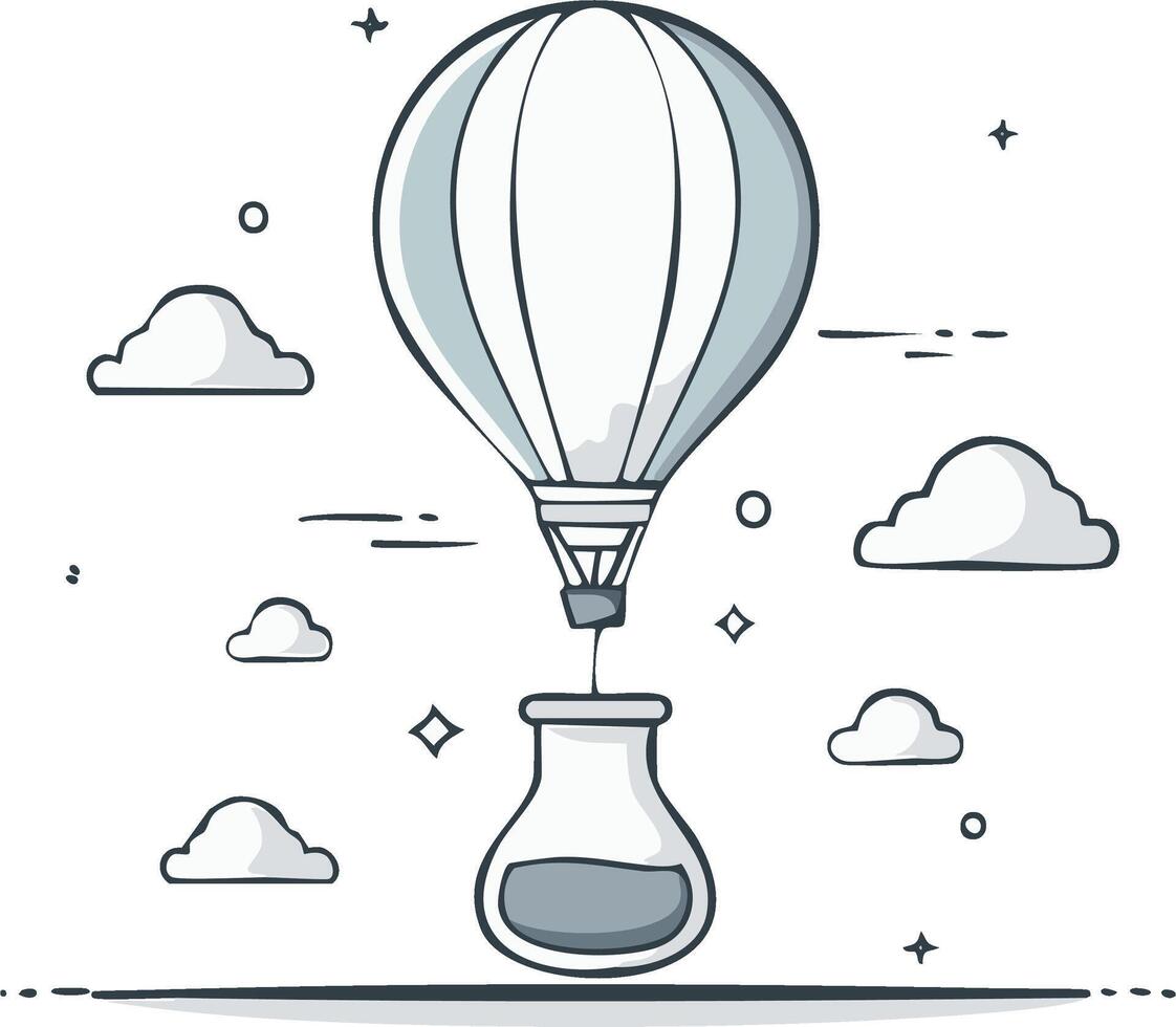 Balloon carrying a flask, science exploration and creativity in a sketched whimsical design with clouds Pro Vector