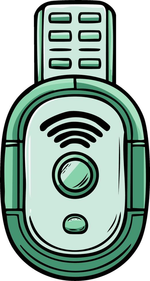 Stylized illustration of a modern electronic device with signal waves and button Pro Vector