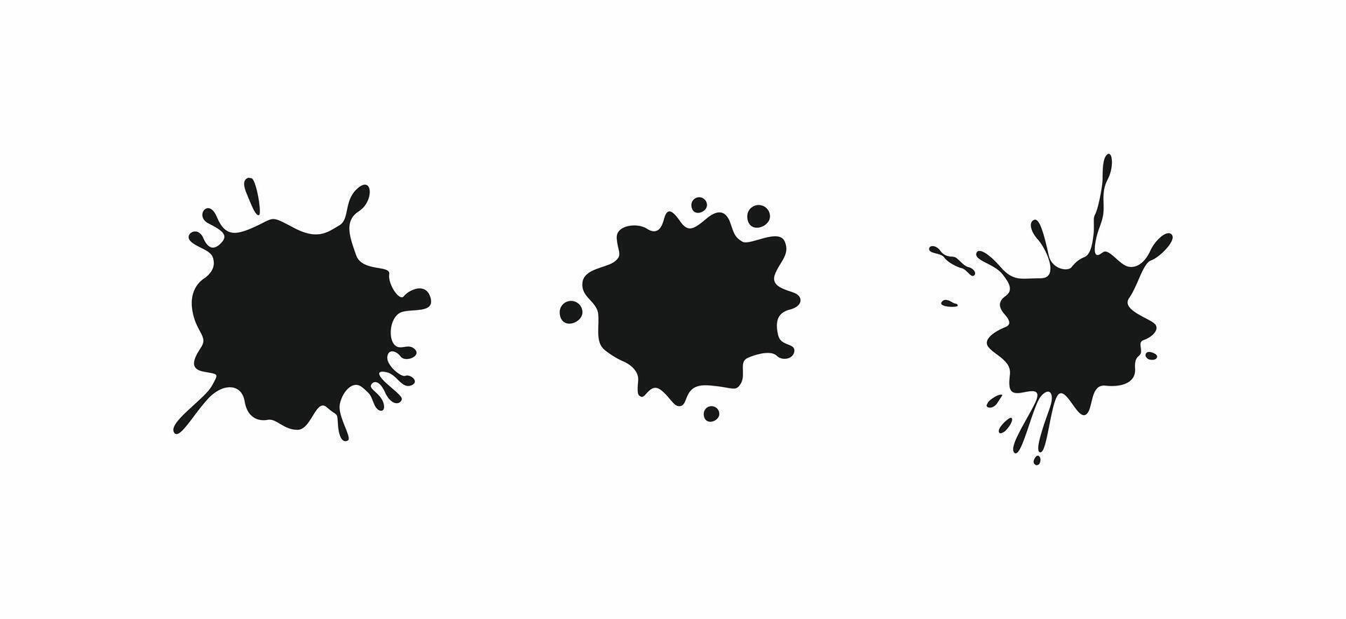 Set of three black ink splatters and stains graphics. Grunge, paint blot collection for abstract backgrounds, distressed texture, and artistic design elements. Isolated on white Pro Vector