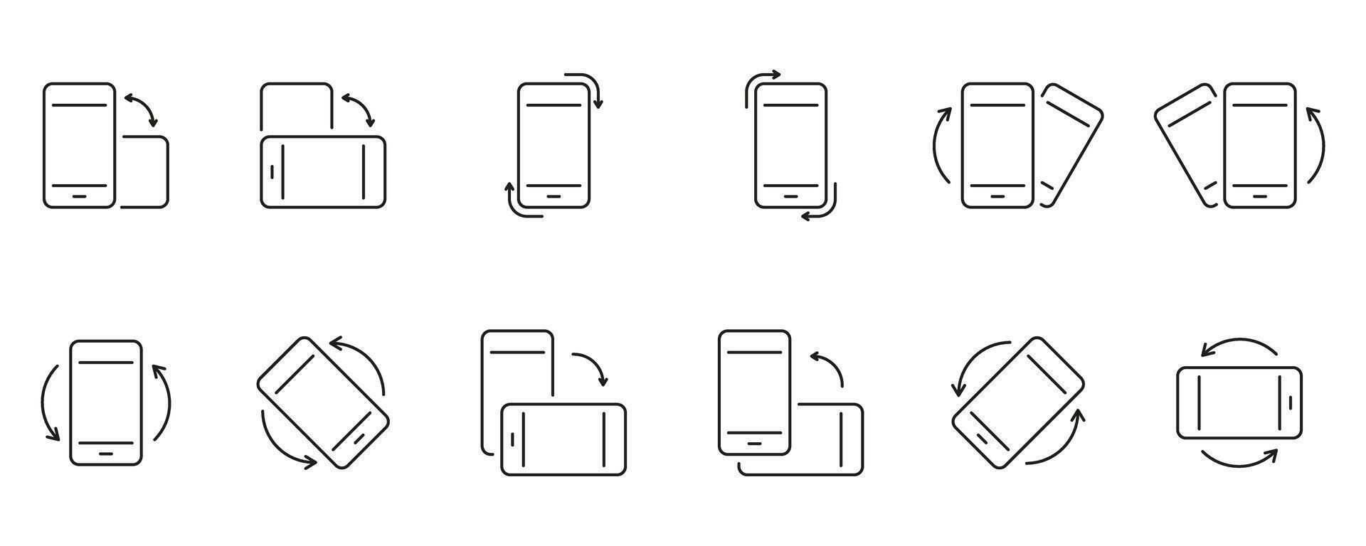 Smartphone Screen Rotation Icon Set. Mobile Phone Orientation Change With Arrows and Motion Indication Outline Symbol Collection. Editable Stroke. Isolated Illustration Pro Vector