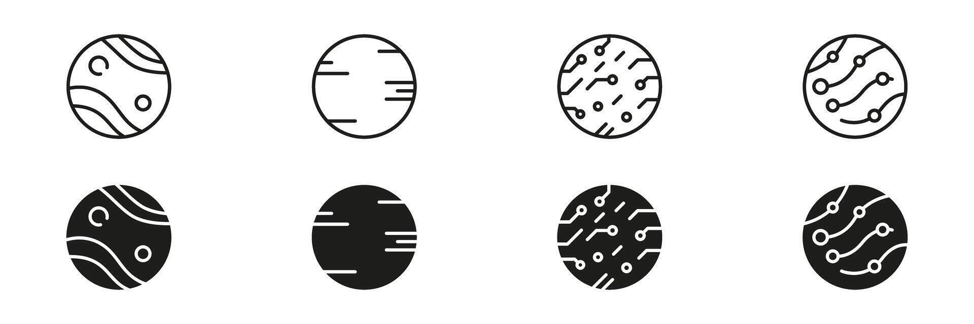 Planetary Surface And Circuit Pattern Line And Solid Icon Set. Space Exploration, Technology Integration, And Digital Connectivity Outline And Silhouette Symbol. Isolated Illustration Pro Vector