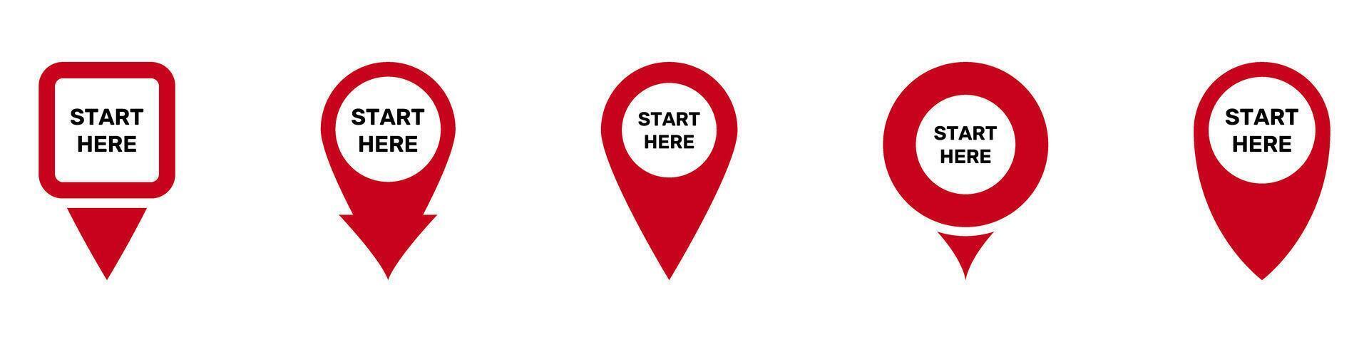 Start Here Location Pin Red Icon Set. Navigation, Beginning Point, And Map Marker Silhouette Symbol Collection. Directional Guidance And Route Planning. Isolated Illustration Pro Vector