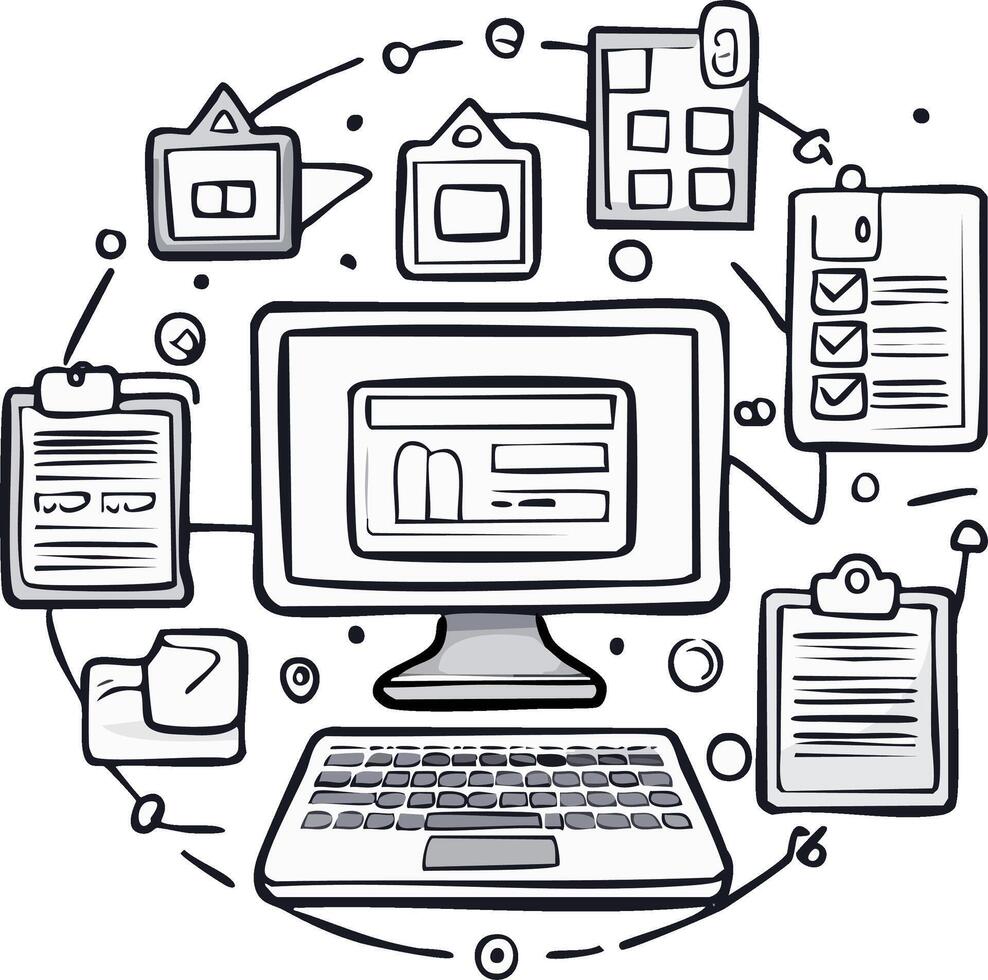 Hand drawn concept of an organized digital workspace with a computer and planning icons Pro Vector