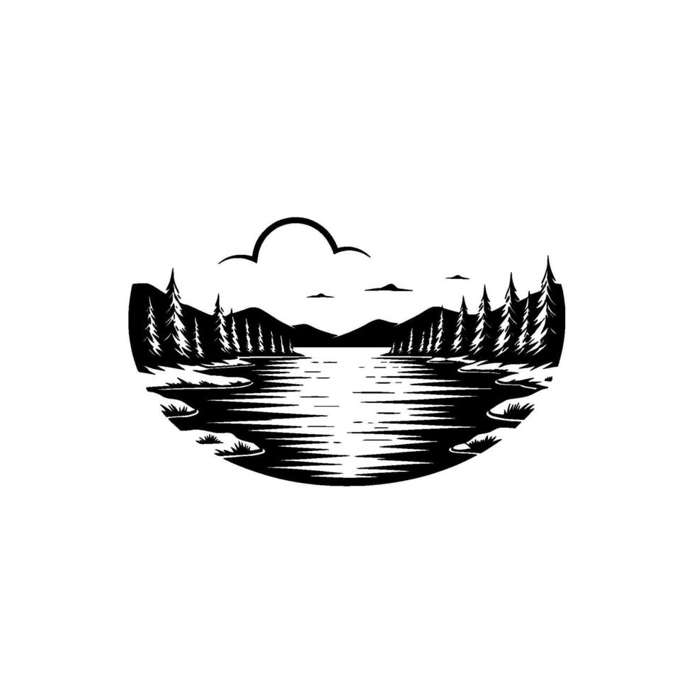Monochromatic silhouette art depicting a serene lake surrounded by evergreen trees and distant mountains under a stylized cloudy sky presented in a circular emblem Pro Vector