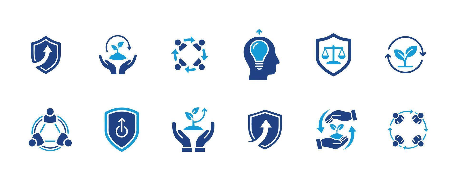 Core Values Icon Set And Art. featuring innovation, goals, responsibility, integrity, customers, commitment, quality, teamwork, reliability, vision, inclusion. perfect flat icons collection pro Pro Vector