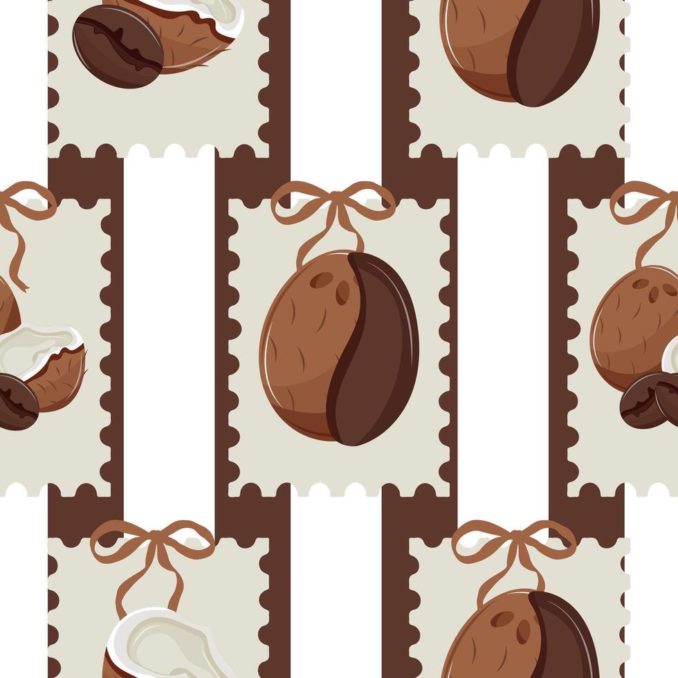 pattern with coconuts in whole and half-open form with coffee beans next to them with stripes behind, for textile, packaging and digital design vector