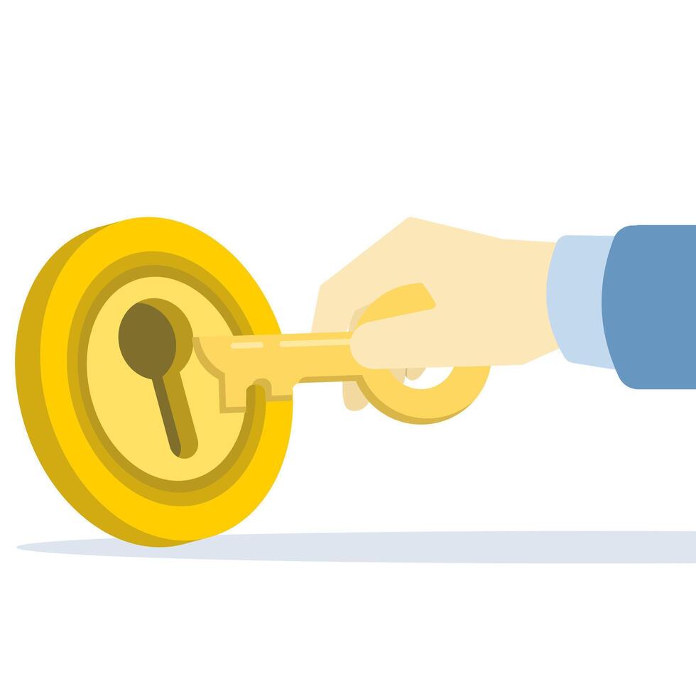 Illustration of a golden key opening a coin-shaped keyhole, representing investment access, unlocking financial potential, and exploring business opportunities. Pro Vector