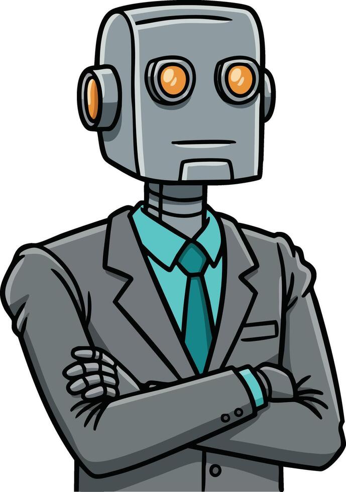 Robot in business suit with crossed arms representing artificial intelligence and professionalism in technology and office environments Pro Vector