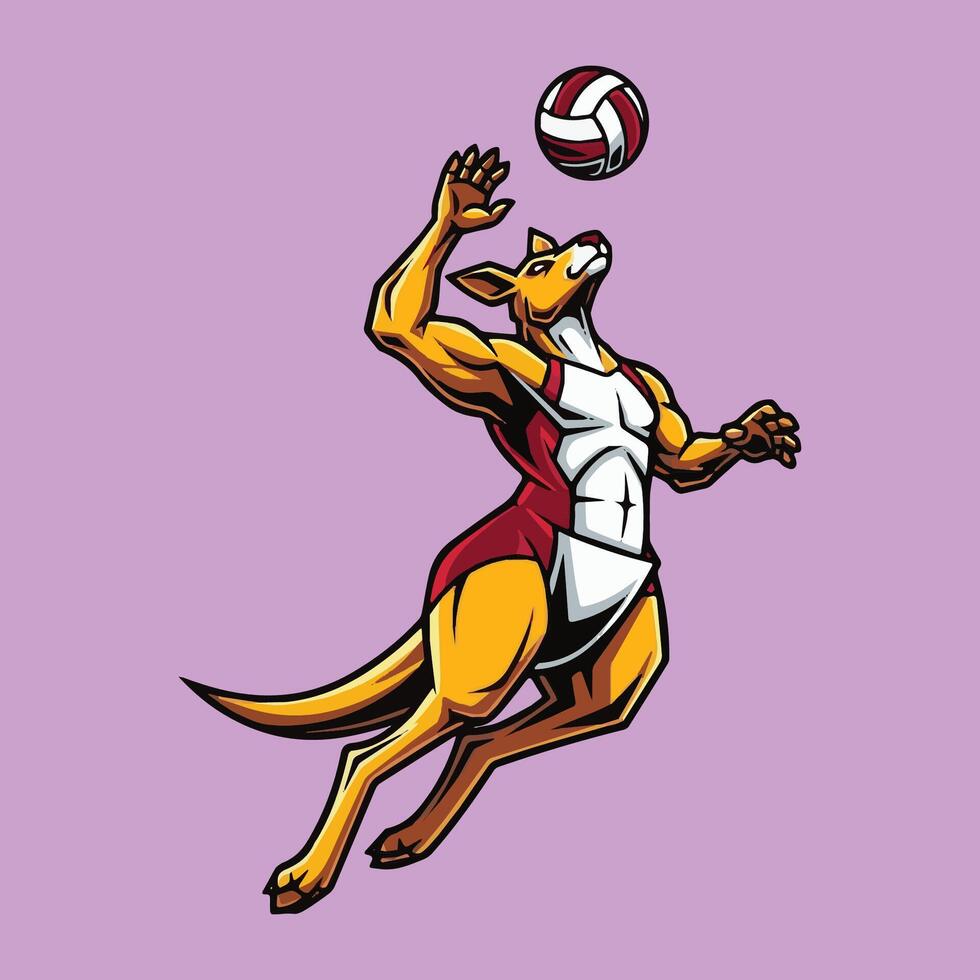 Dynamic kangaroo mascot illustration jumping to serve a volleyball with power and agility Pro Vector