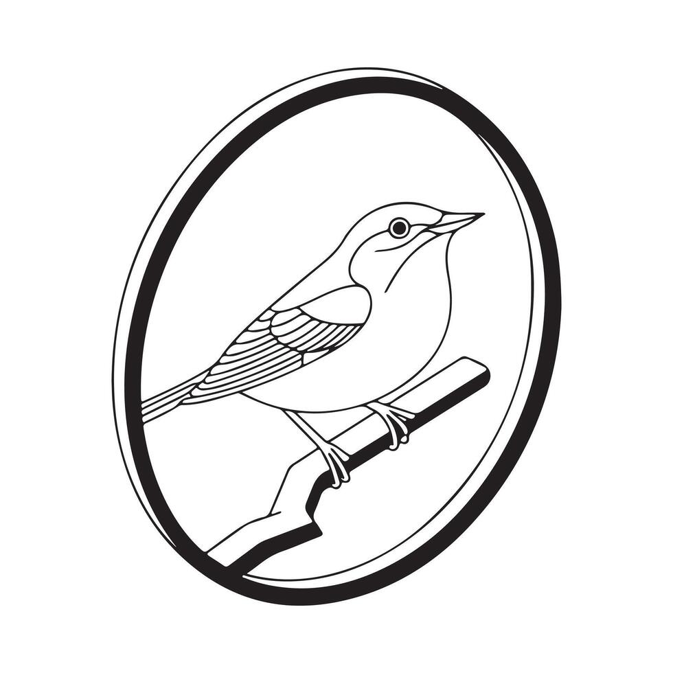 Minimalist black and white outline drawing of a small bird perched on a branch inside a circular frame Pro Vector