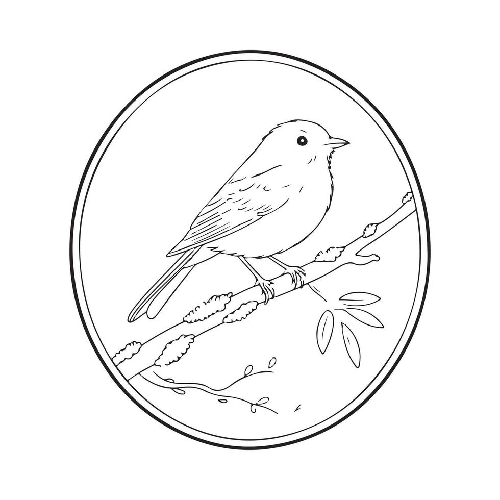 A simple black and white line art of a small bird sitting on a budding branch inside a circular frame. Pro Vector