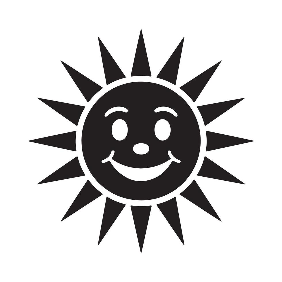 A friendly smiling sun icon with sharp triangular rays in black and white Pro Vector