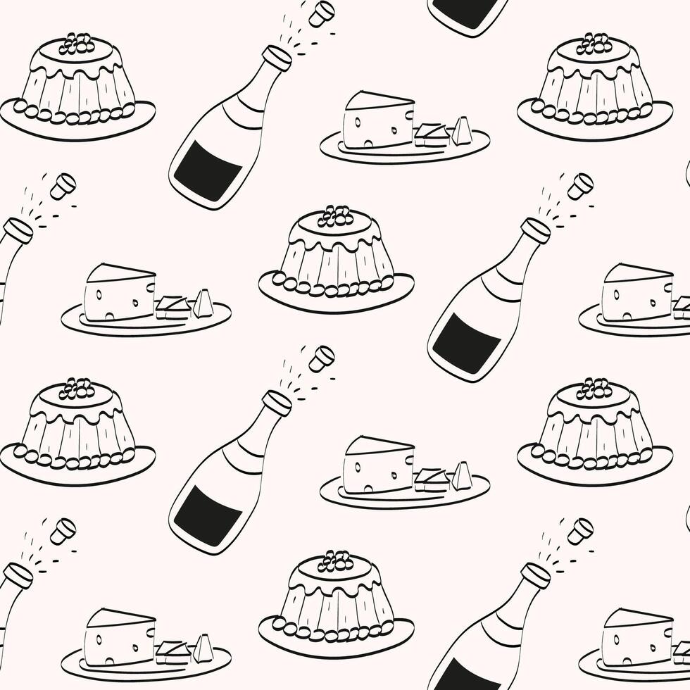 Desserts on plates with champagne bottles creating a festive mood in a simple black and white pattern Pro Vector