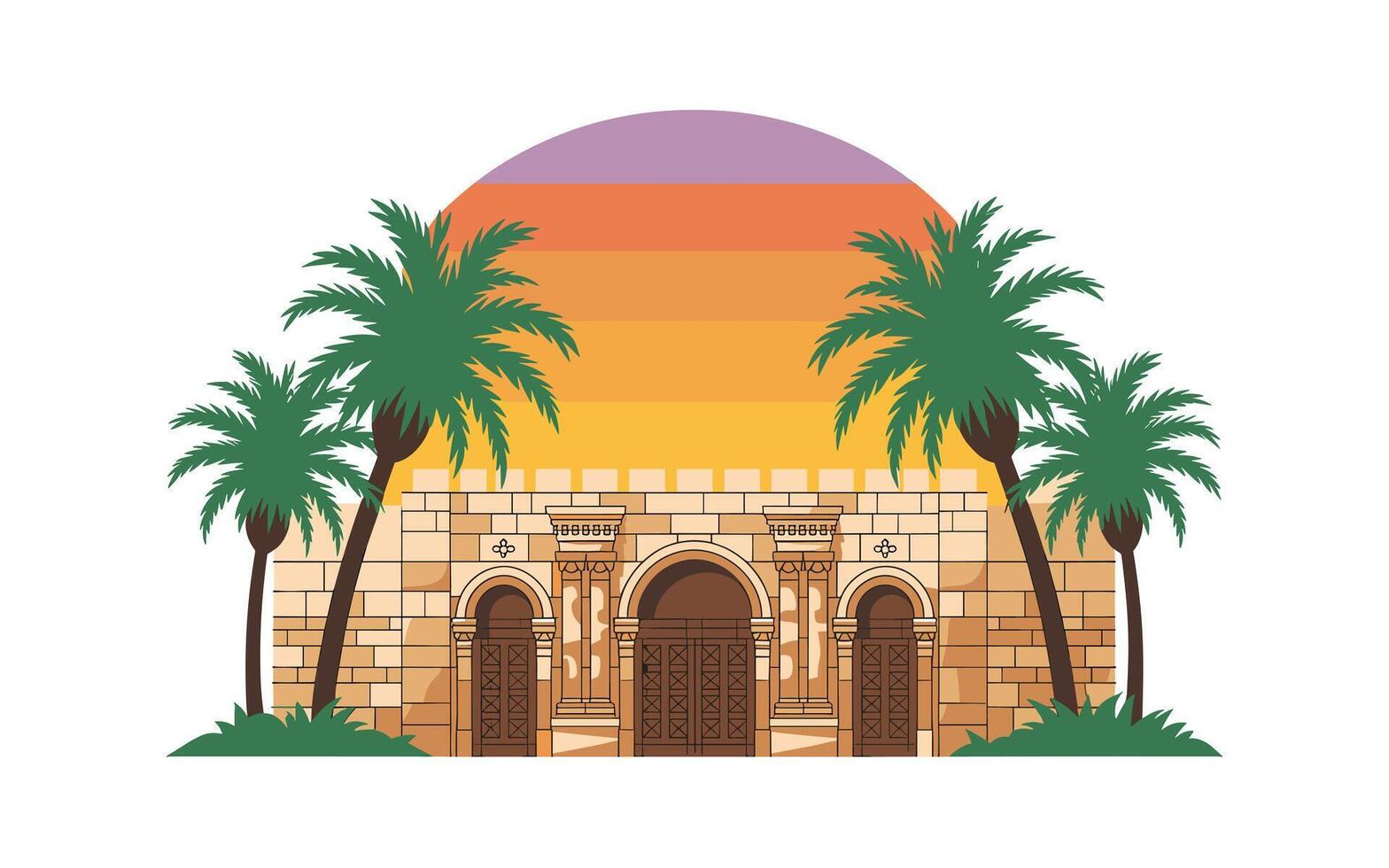 Illustration of a serene desert landscape with palm trees and ancient architecture at sunset Pro Vector