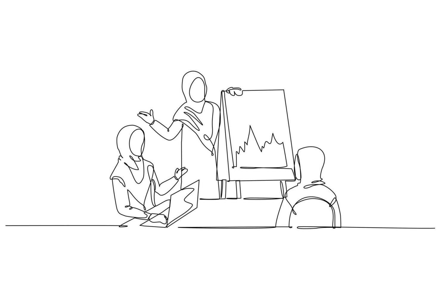 Single continuous line drawing three Arab women engaged in business meeting, present market data on fluctuating chart while using laptop for analysis. One line draw graphic design illustration Pro Vector