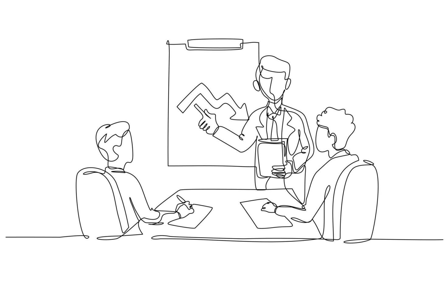 Single continuous line drawing male manager showing downturn chart to two seated colleagues taking notes. Review of poor finance business performance. One line draw graphic design illustration Pro Vector