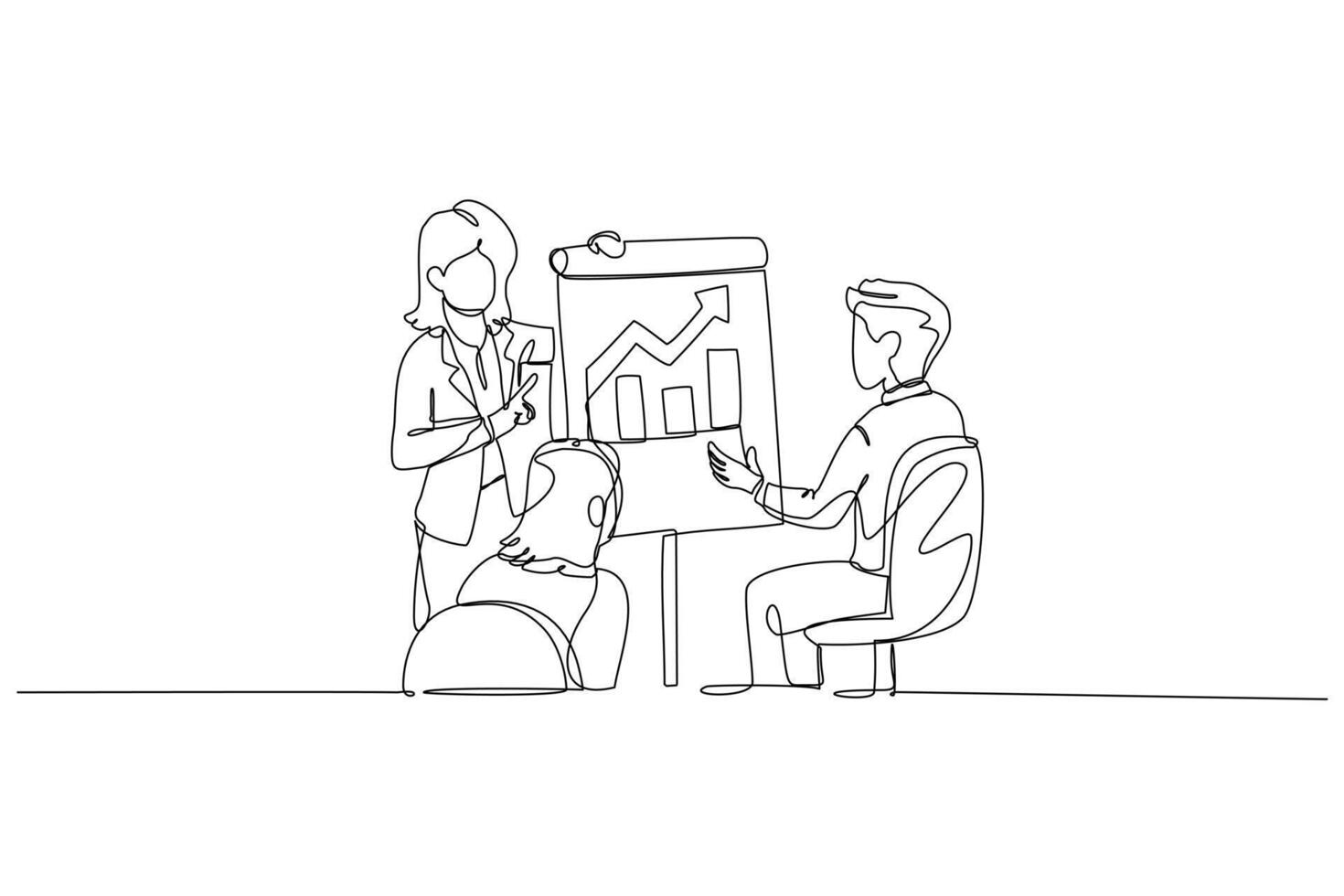 Continuous one line drawing three colleagues, one female presenting growth chart with bar and line graphs. Successful strategy in corporate meeting. Single line draw design graphic illustration Pro Vector