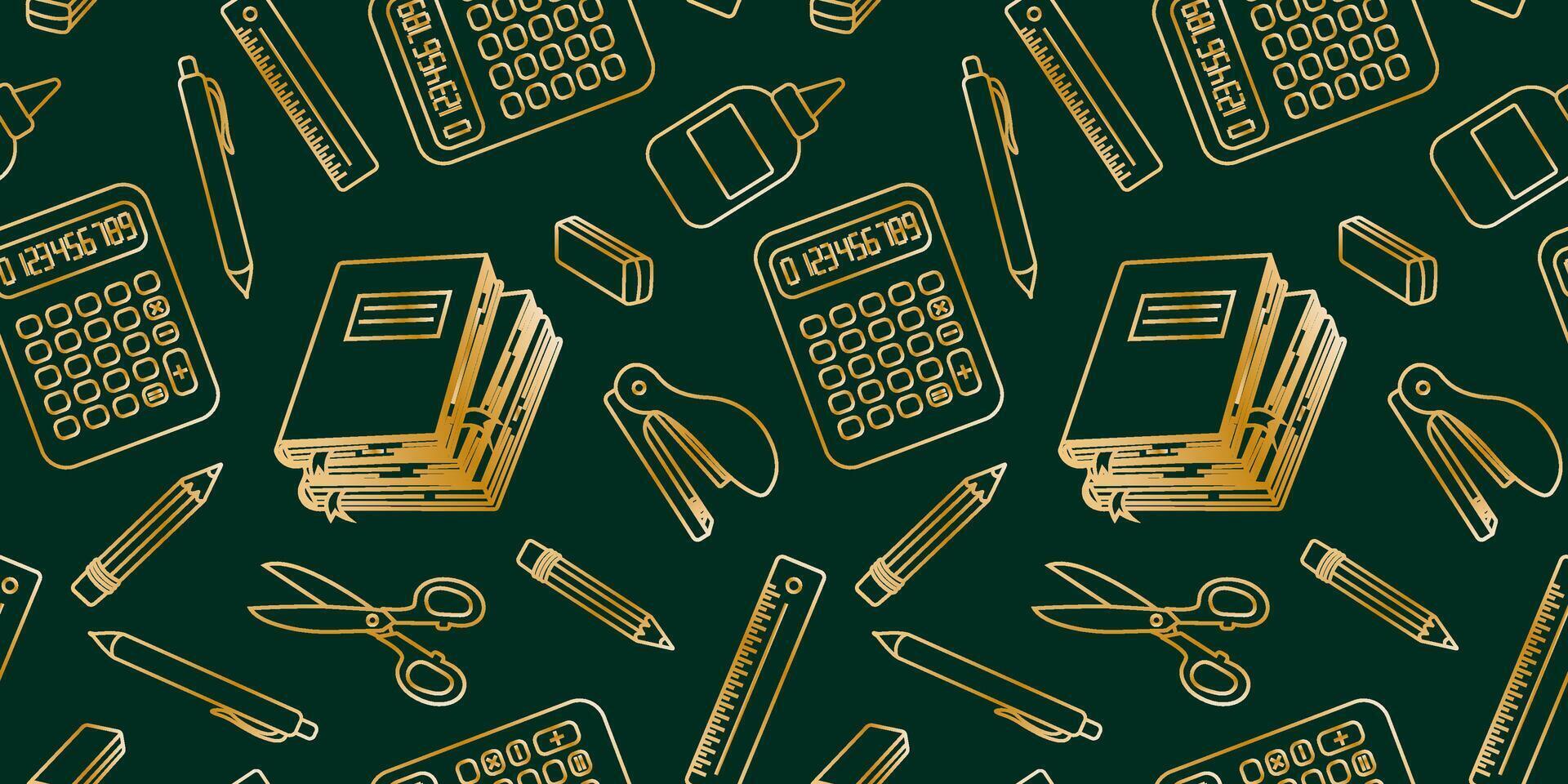 luxury background design with gold line art elements calculator pencil notebook scissors glue back to school season print wrapping paper fabric texture Pro Vector