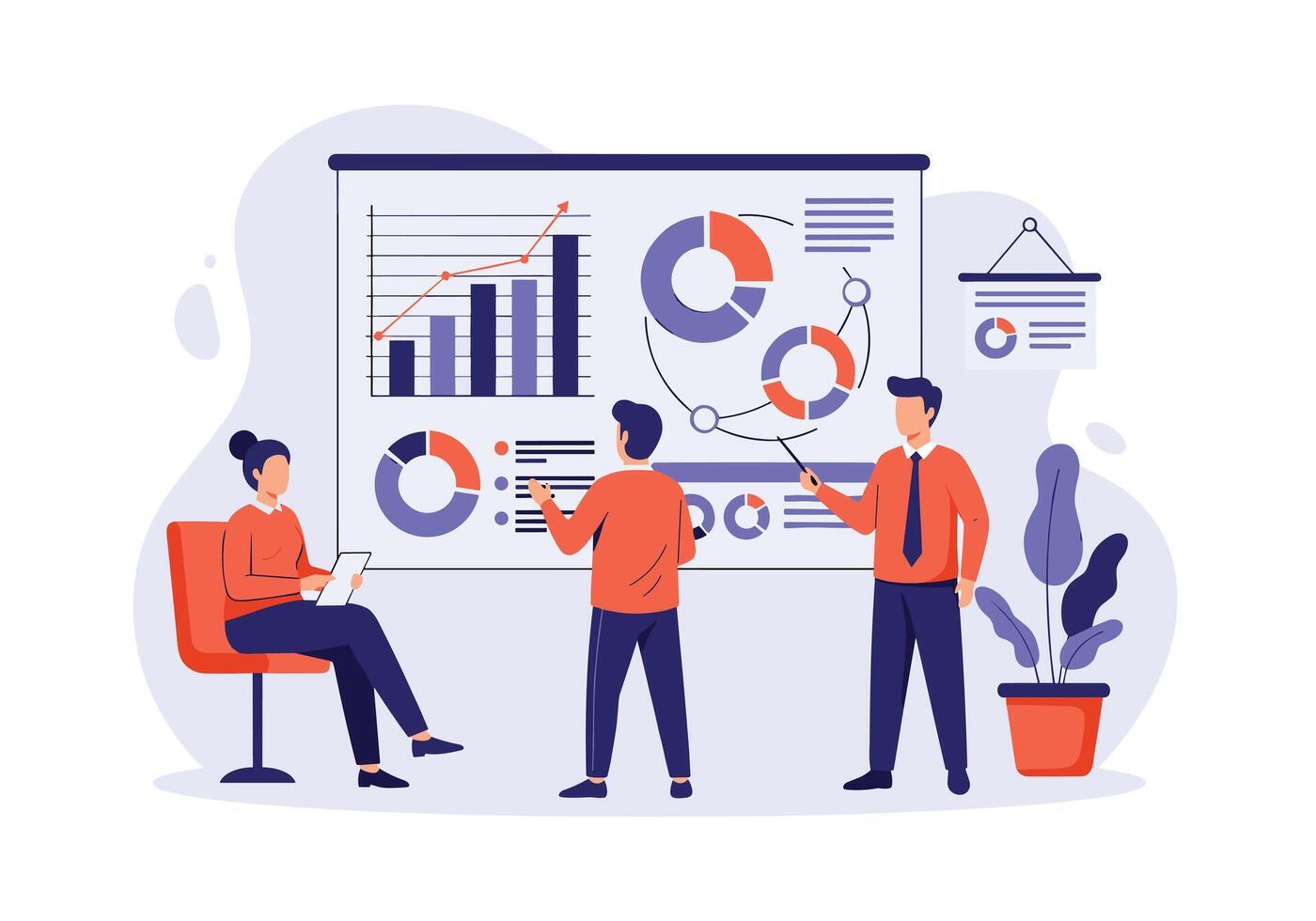 Team members present data insights during a dynamic chart review as colleagues discuss graphs metrics and trends in a bright modern office setting. Pro Vector