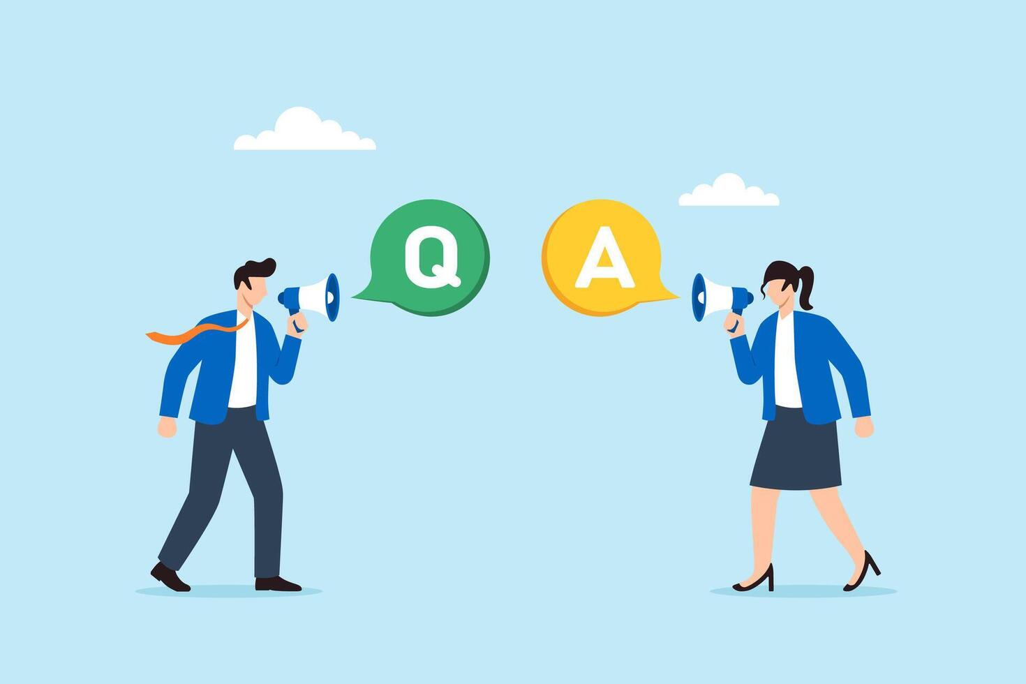 Flat illustration of business people using megaphones to exchange Q and A symbolizing communication discussion collaboration and problem solving Pro Vector