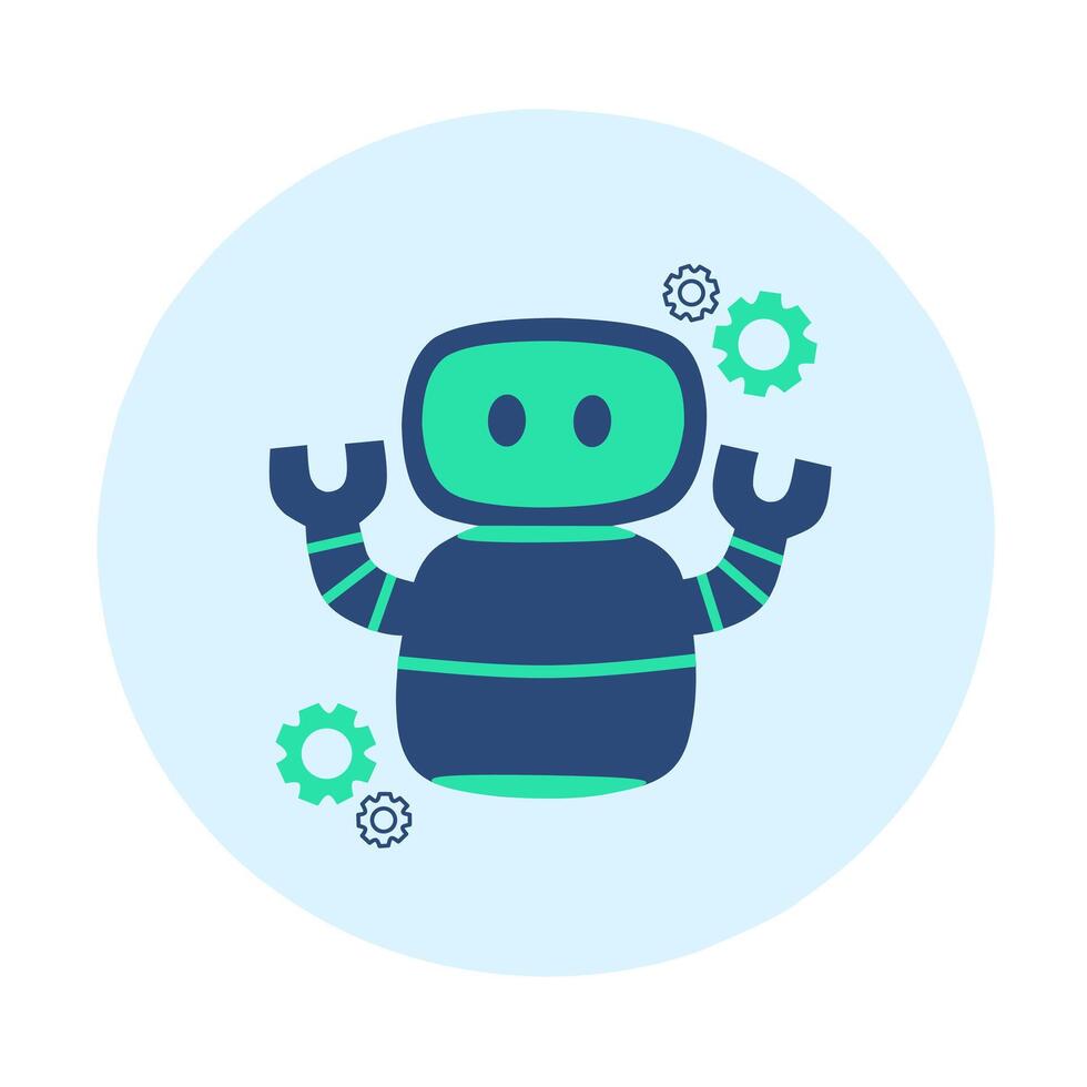 A cute flat icon illustration of a simple robot with a gear symbol in blue and green tones inside a circular shape, designed for technology, artificial intelligence, automation, futuristic design Pro Vector