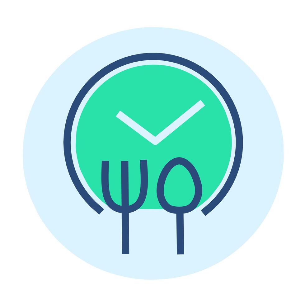 Flat icon illustration of a clock combined with fork and spoon in blue and green tones on a light blue circular background, representing mealtime schedules, fasting time, and daily eating routines Pro Vector