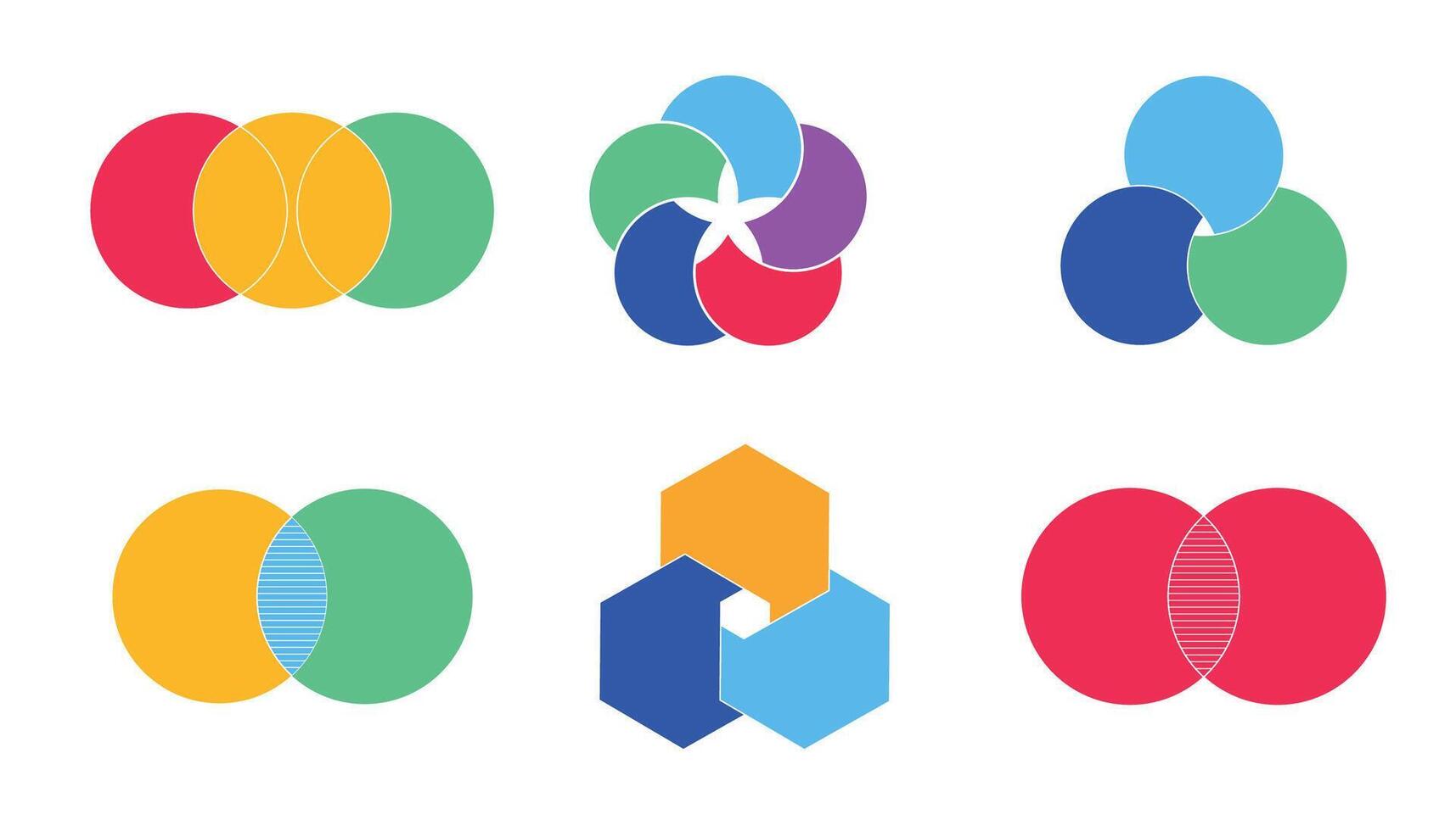 Graphical Venn diagram infographic sections set. Overlapping shapes circles chart line. Venn diagrams with overlapping circles, showing a common area, for infographic presentation Pro Vector